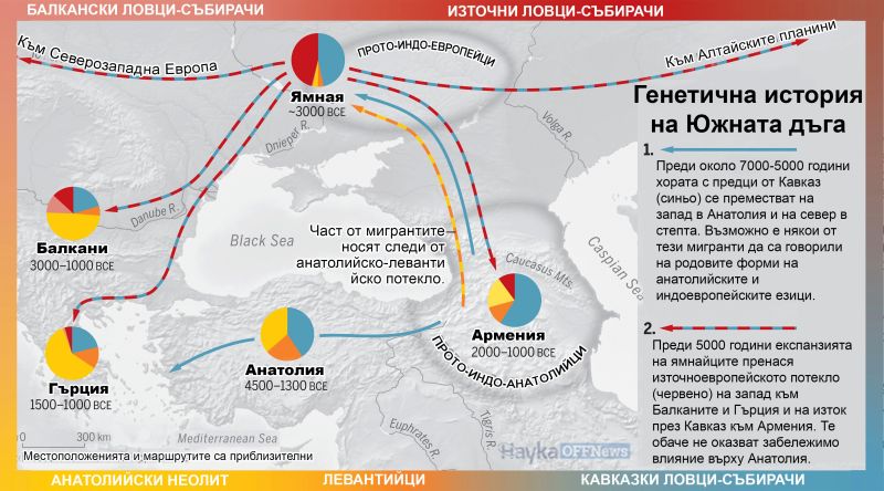 Всички говорими индоевропейски езици (напр. български, арменски и санскрит) могат да бъдат проследени до степните скотовъдци от Ямната култура, с произход от кавказки ловци-събирачи и източни ловци-събирачи, които инициират верига от миграции през Евразия преди около 5000 години. Техните южни експанзии на Балканите и Гърция и на изток през Кавказ в Армения оставят следа в ДНК на хората от бронзовата епоха в региона.