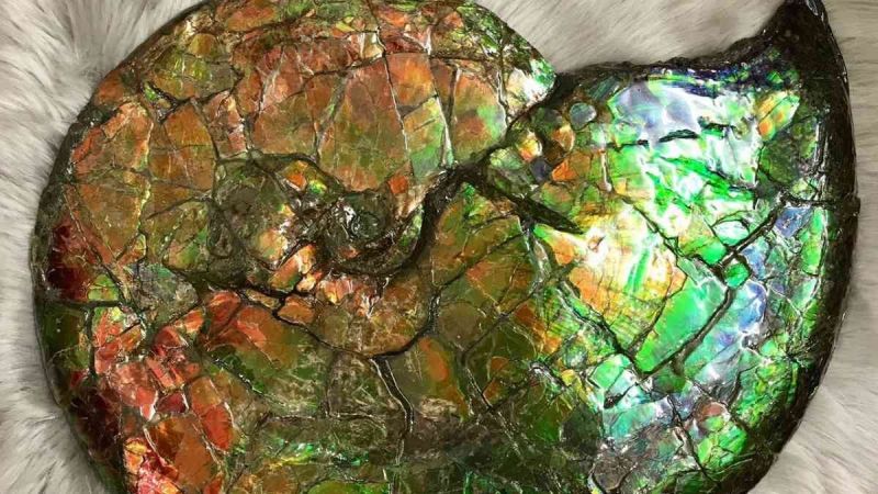 Скъпоценните камъни амолит са вкаменелости от черупки на амонити, известни със своя ярък цвят и преливания, променящи оттенъка си между червено, зелено и синьо, когато се гледат от различни ъгли.