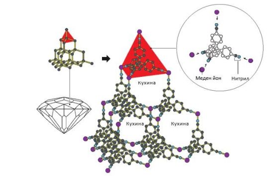 Фигура 2. Ричард Робсън е вдъхновен от структурата на диаманта, в която всеки въглероден атом е свързан с четири други в пирамидална форма. Вместо въглерод, той използва медни йони и молекула с четири разклонения, всяко с нитрил в края. Това е химично съединение, което се привлича от медни йони. Когато веществата се комбинират, те образуват подреден и много просторен кристал. Кредит: Johan Jarnestad/The Royal Swedish Academy of Sciences