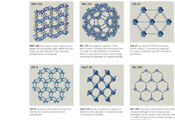 Фигура 7. MOF-303 може да улавя водни пари от пустинния въздух през нощта. Когато слънцето нагрява материала сутрин, се освобождава питейна вода. ZIF-8 е използван експериментално за добив на редкоземни елементи от отпадъчни води. MIL-101 има гигантски кухини. Използван е за катализиране на разлагането на суров петрол и антибиотици в замърсена вода. Може да се използва и за съхранение на големи количества водород или въглероден диоксид. CALF-20 има изключителен капацитет да абсорбира въглероден диоксид. Тества се във фабрика в Канада. UiO-67 може да абсорбира PFAS от вода, което го прави обещаващ материал за пречистване на вода и отстраняване на замърсители. NU-1501 е оптимизиран за съхранение и освобождаване на водород при нормално налягане. Водородът може да се използва за гориво на превозни средства, но в обикновените резервоари за високо налягане газът е изключително експлозивен. Кредит: Johan Jarnestad/The Royal Swedish Academy of Sciences