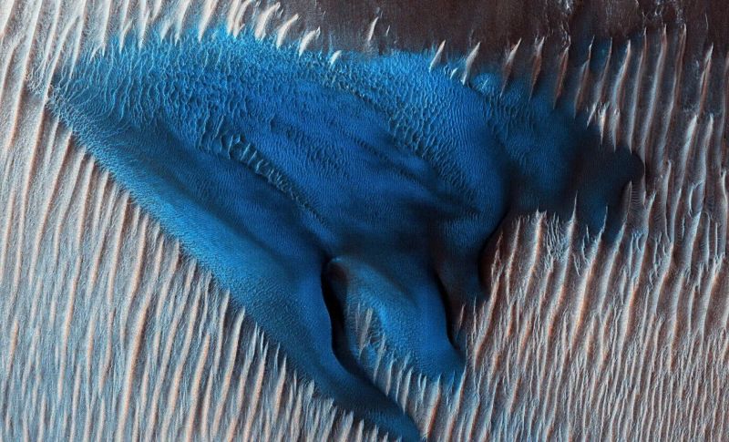 Синя дюна, заснета от орбиталния апарат Mars Reconnaissance Orbiter (MRO) на НАСА, повдигна нови въпроси относно вятъра, седиментите и геоложкото разнообразие на Червената планета. Въпреки че оцветяването е изкуствено подсилено, уникалните характеристики на това образувание, разположено в два отделни кратера, са всичко друго, но не и обикновени.