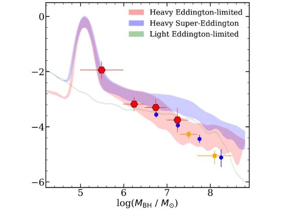 Сравнение на BHMF от различни предишни проучвания и новата статия. Червените шестоъгълници са точки от данни, изчислени с помощта на наблюдаваното AGN в тази работа, докато сините кръгове и жълтите квадрати са измервания, изчислени с помощта на наблюдаваните AGN в предишни трудове. Червените, зелените и сините защриховани области представляват очакваната функция на масата на черната дупка (BHMF) от различни теоретични модели.