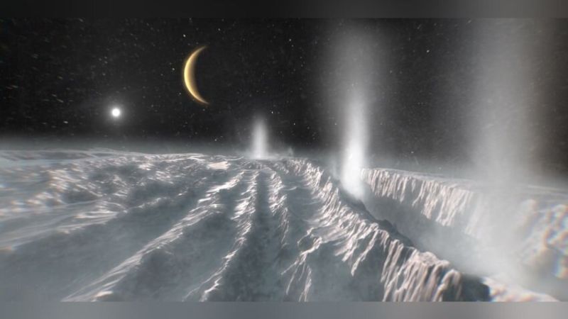 Струите пари се изхвърлят от пукнатини близо до южния полюс на Луната, изпращайки ледени зрънца в космоса, където те падат обратно на повърхността или се отклоняват, за да образуват пръстен около Сатурн.