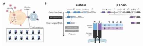 А. Т-клетките разпознават микробните пептиди чрез своите рецептори TCR, които се свързват с пептидни фрагменти, представени от молекули от гавния комплекс за хистосъвместимост (MHC). Това взаимодействие може да задейства активиране на Т-клетките. Всяка Т-клетка експресира уникален TCR, генерирайки силно разнообразни Т-клетъчни репертоари, способни да разпознават почти неограничен брой чужди пептиди. B. Разнообразието на TCR произтича от комбинаторното сглобяване на множество гени, кодирани от зародишната линия, заедно с вмъкване и/или подрязване на нематрични нуклеотиди във V-J връзката на a-веригата и V-D и D-J връзките на b-веригата. Човешкият TCR локус съдържа 54 V гена, 61 J гена и 1 константен (C) ген, а TCR-блокът съдържа приблизително 67 V гена, 2 D гена, 14 J гена и 2 константни гена. Кредит: Nobel Prize