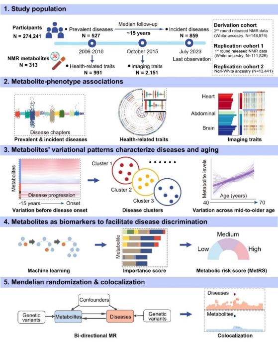 С развитието на метаболомичните технологии и алгоритмите за изкуствен интелект (AI), мултидисциплинарен, интердисциплинарен екип, ръководен от професор Ю Джинтай от катедрата по неврология в болница Хуашан и Института за наука и технологии за интелигентност, вдъхновена от мозъка, в университета Фудан, комбинира мащабни фенотипни данни, за да анализира систематично връзката между метаболитите и човешкото здраве и болести за първи път, картографирайки връзката (Фигура 2).