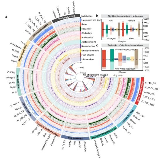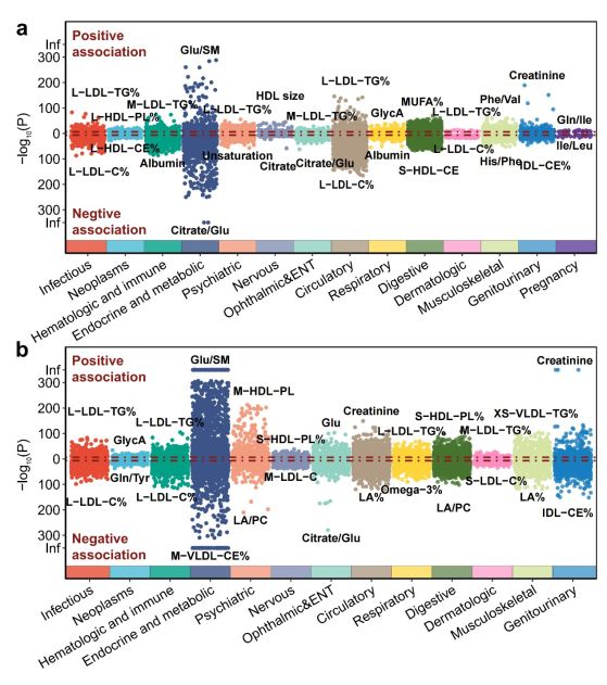 Проучването систематично оценява асоциациите на 313 метаболитни маркера, получени чрез ядрено-магнитен резонанс (ЯМР), с 527 предшестващи състояния и 859 новодиагностицирани заболявания, идентифицирайки общо 52 836 значими асоциации метаболит-заболяване (Фигура 3). Сред тях, голямото съотношение LDL холестерол/общи липиди (L-LDL-C%) показва най-голям брой асоциации, обхващащи 526 състояния, следвано от голямото съотношение LDL триглицериди/общи липиди (L-LDL-TG%), което предполага, че нарушенията на липидния метаболизъм имат широко разпространено въздействие върху мултисистемните заболявания.
