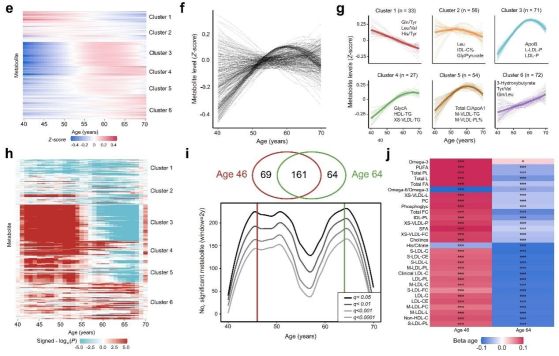 За да разкрият динамичните промени в метаболизма с възрастта, изследователският екип използва DE-SWAN анализ и установи, че плазмените метаболити претърпяват "скаловидни" промени в две ключови възрастови точки: 46 и 64 години. Това предполага, че метаболомът може да претърпи два систематични етапа на ремоделиране в средна и напреднала възраст. Тези открития не само предоставят насоки за разбиране на механизмите на стареене, но и осигуряват основа за специфични за възрастта стратегии за управление на здравето и интервенция (Фигура 5).