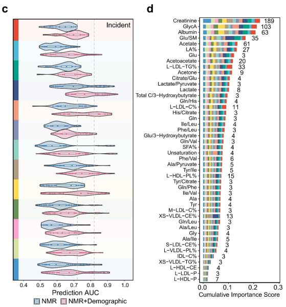 Например оценката на метаболитния риск е постигнала AUC над 0.9 за прогнозиране на диабетна ретинопатия и диабетна бъбречна недостатъчност, демонстрирайки потенциала му за ранно идентифициране на основни хронични заболявания. Проучването е идентифицирало креатинина, гликопротеиновите ацетилни групи и албумина като ключови метаболити за диагностициране и прогнозиране на множество заболявания.