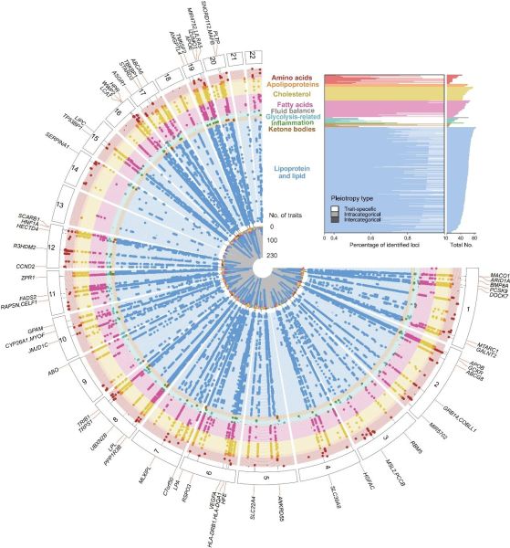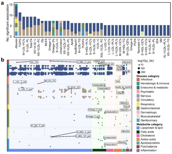Например нивата на албумин са положително корелирани със заболявания като хронично бъбречно заболяване и улцерозен колит, докато делът на свободния холестерол в малките HDL частици (S-HDL-FC%) показа значителен защитен ефект. Локусът PCSK9 играе ключова роля в метаболизма на LDL/VLDL и коронарната болест на сърцето, предоставяйки насоки за разработване на нови лекарствени мишени.