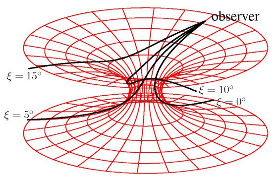 Червеевата дупка на Мирис-Торн (Morris-Thorne) е едно от най-простите, нетривални решения на Айнщайновата Обща теория на относителността. Схемата показва какво ще види един наблюдател, пътуващ през пространство-времето на червеевата дупка. Thomas Müller, Haus der Astronomie/MPIA