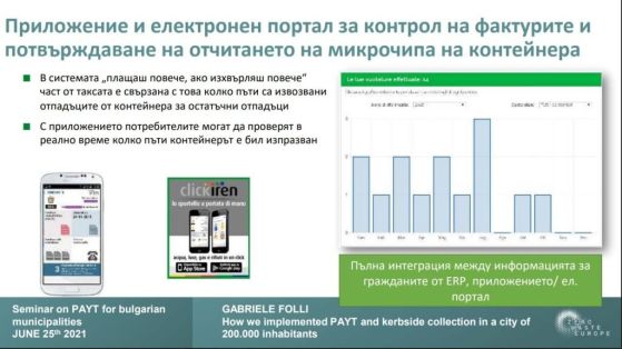 В Парма, например, преминаването към система с плащане на база количество води до над 70% разделно събиране и съществен спад на смесения отпадък. Така общината плаща много по-малко за депониране и изгаряне – двете най-скъпи услуги в управлението на отпадъците. Същият модел се наблюдава и в словенските общини, където разходите по депониране спадат с между 30% и 50% още в първата година.