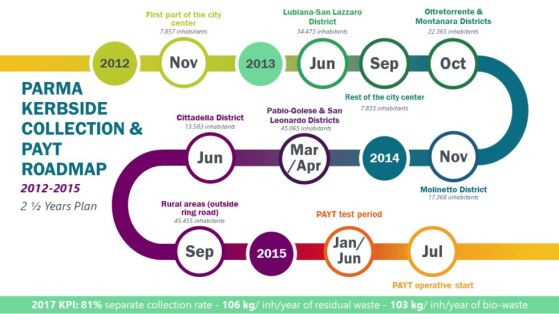Времева линия на промяната в сметосъбирането в община Парма (от 2012 до 2015 г.)
