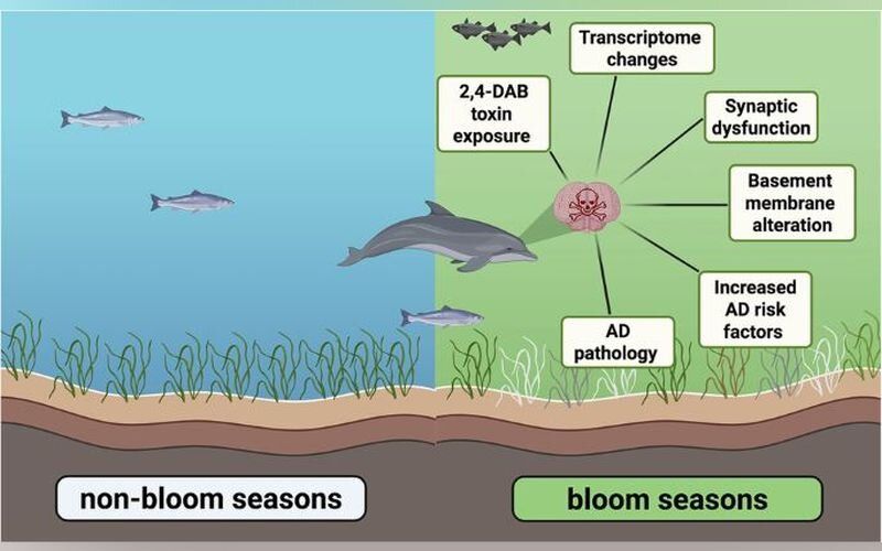 Делфините, изхвърлени на брега по време на цъфтеж на водораслите, показват 536 различно експресирани гена в сравнение с тези, изхвърлени на брега през зимните месеци. Генетичните сигнатури сочат нарушени GABAергични синапси, промени в базалните мембрани и множество рискови фактори за Алцхаймер. Генът аполипопротеин Е, най-добрият предсказващ биомаркер за Алцхаймер при хората, е повишен до 6,5 пъти при някои делфини.