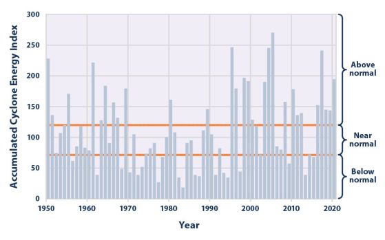 Фиг 5. Общи годишни стойности на индекса на натрупаната енергия на циклоните (ACE), който отчита силата, продължителността и честотата на циклоните от 1950 до 2020 г. Източник