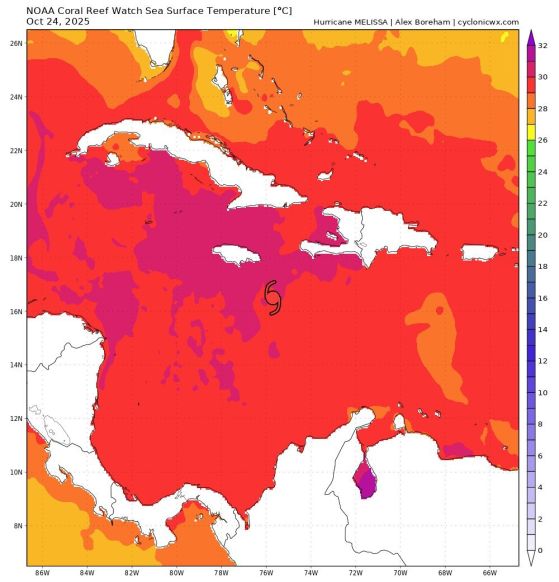 Фиг. 3. Необичайно високата температура на повърхността на морската вода около о-в Ямайка непосредствено преди преминаването на урагана „Мелиса“. Източник