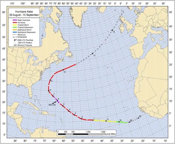 Такъв пример е ураганът „Катя“ (2011 г.), роден западно от Африка. След като преминава Карибите и отслабва, той се трансформира в умерен циклон по пътя си към Европа (Фиг. 9).