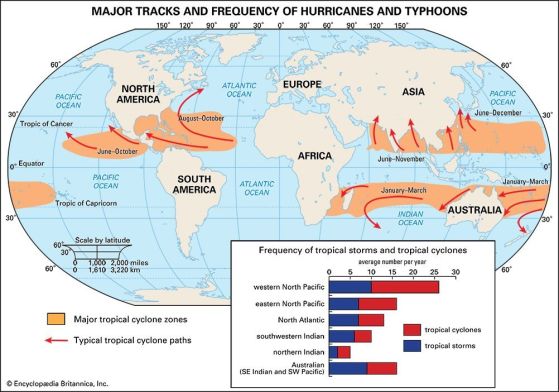 Фигура 1. Основни области в света на преминаване на тропически циклони с обозначен времеви период на най-голяма честота (т.нар. сезон на циклоните). Източник